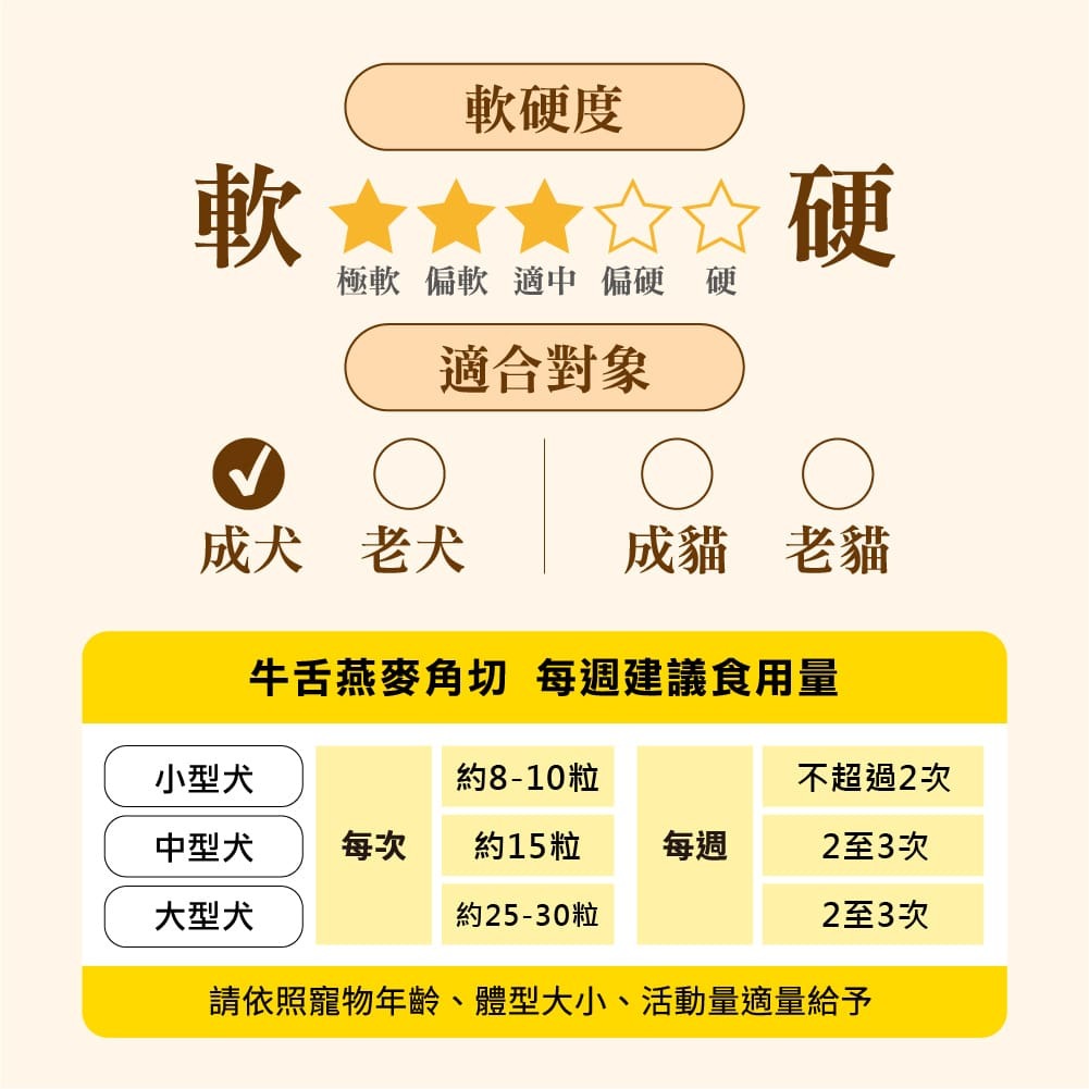 以美國牛肉、牛舌與嚴選愛之味進口澳洲燕麥為原料,製成0.5cm小方塊,特別適合小型犬。澳洲燕麥含膳食纖維,幫助維持消化機能。高適口性是挑嘴毛孩首選零食。