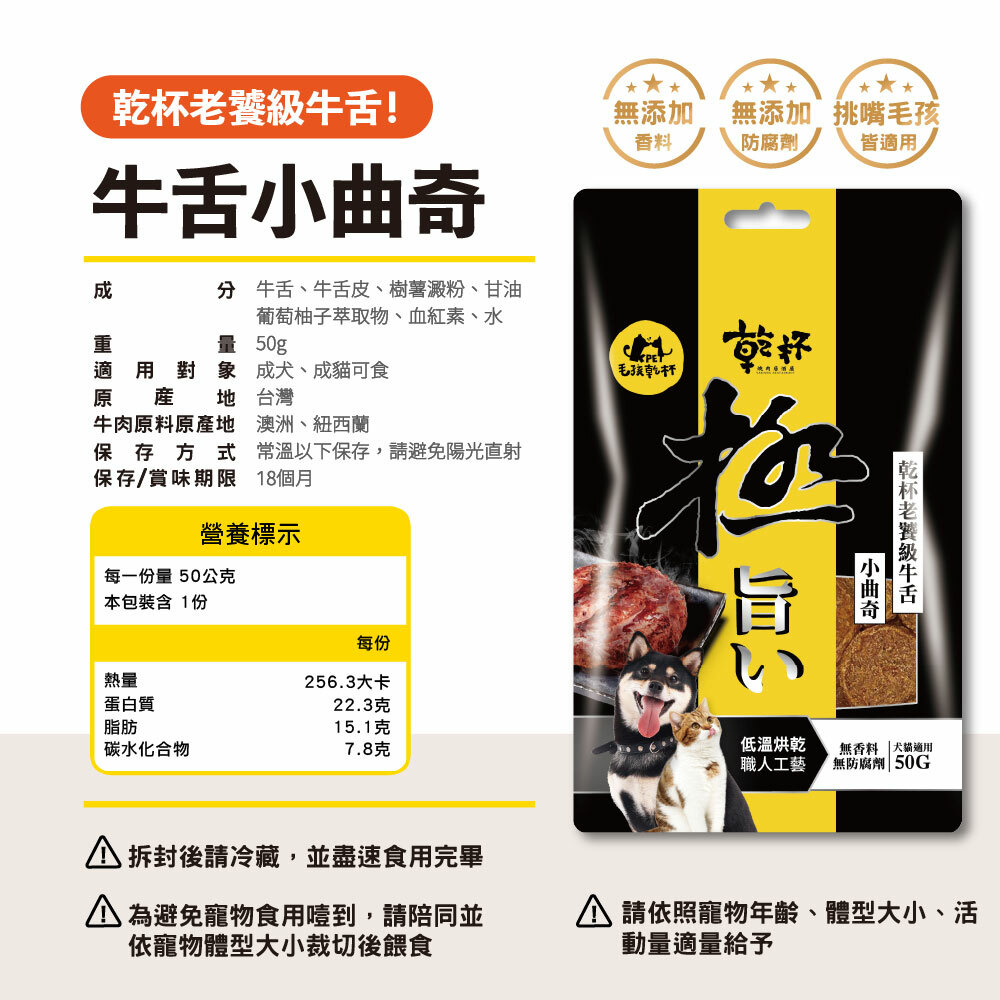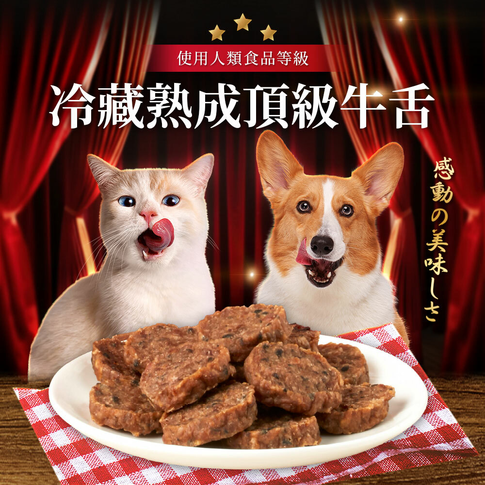 使用乾杯集團自行進口人食等級冷藏熟成頂級牛舌,70度低溫烘焙,維持口感、鎖住營養。