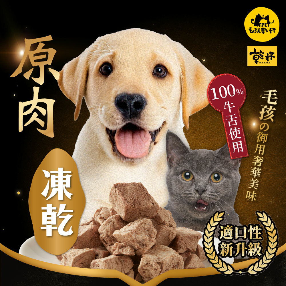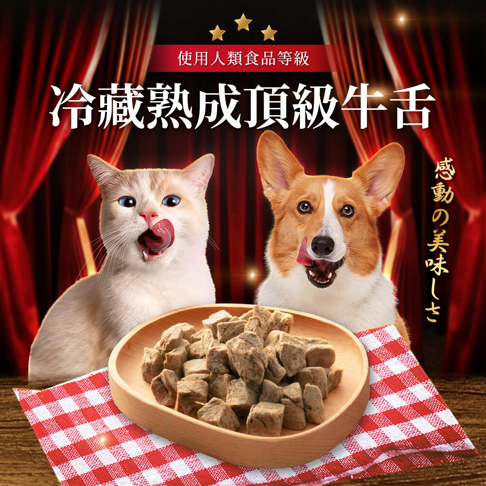 使用乾杯集團自行進口人食等級冷藏熟成頂級牛舌,100%原肉冷凍乾燥製成,完整保留牛舌風味與營養。
