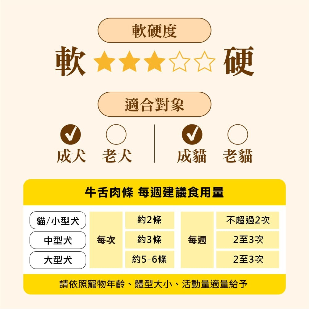 使用人食等級冷藏熟成頂級牛舌,70度低溫烘焙,維持口感、鎖住營養。香氣迷人,條狀方便食用。毛孩乾杯經典不敗人氣商品。