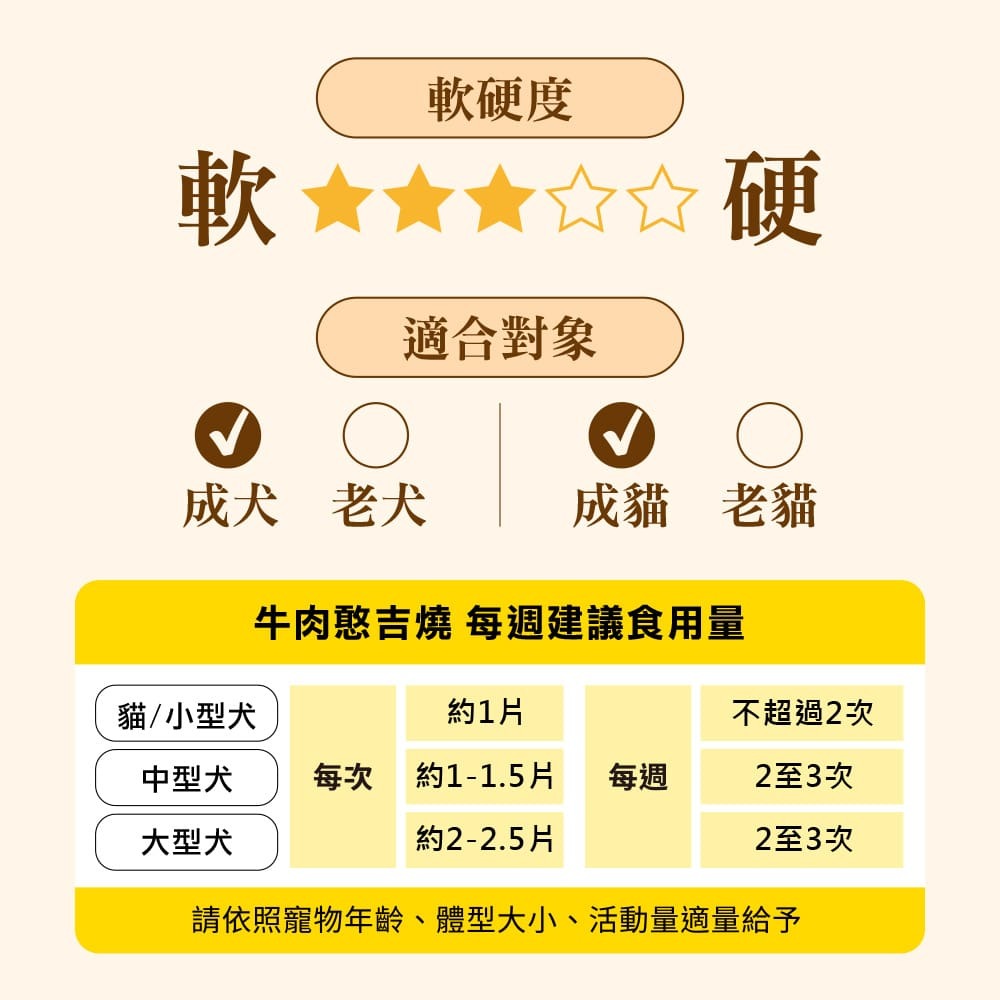 以完整地瓜圓片抹上雞肉/美國牛肉/牛舌肉以黃金比例調製成的肉泥。地瓜富含膳食纖維,牛舌肉含有天然牛磺酸。商品低溫烘焙製成,適口性高,是給毛孩的美味牛肉蔬食點心。
