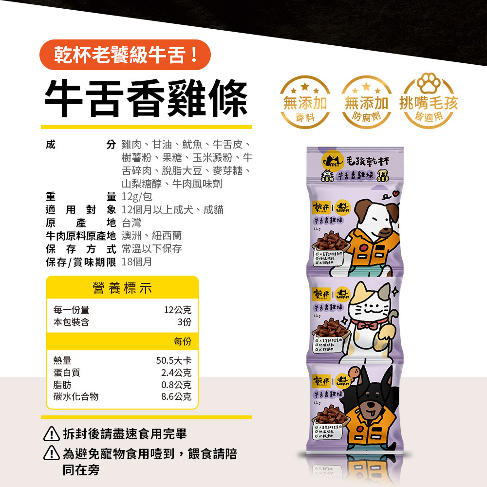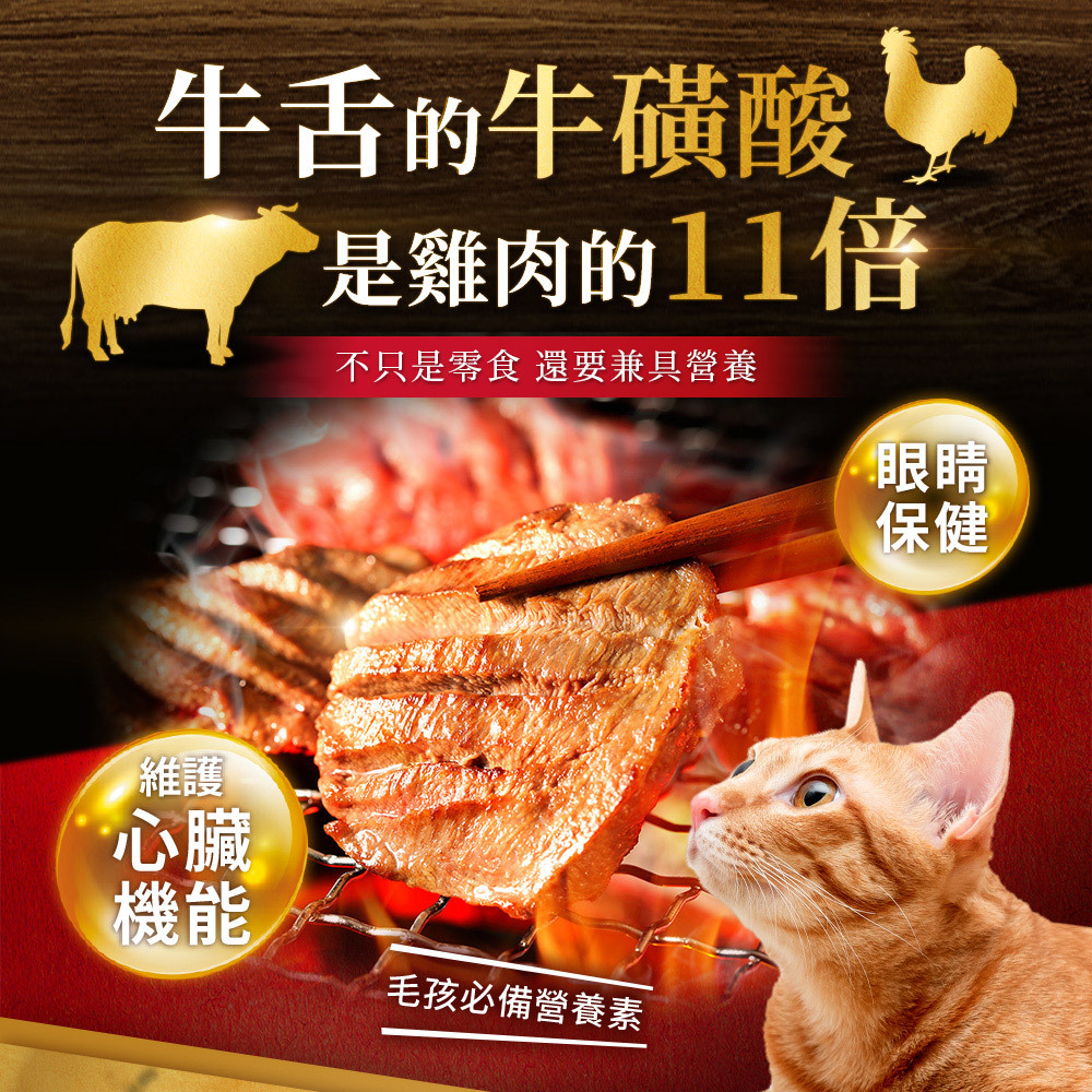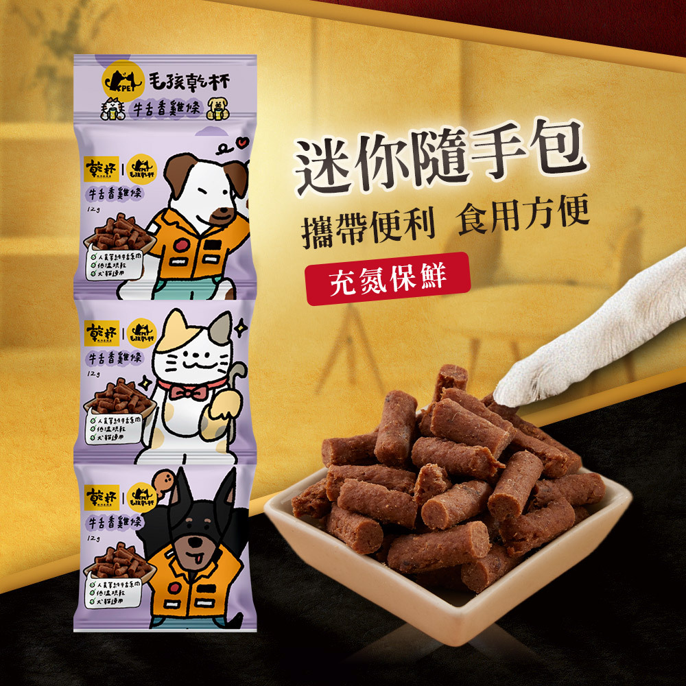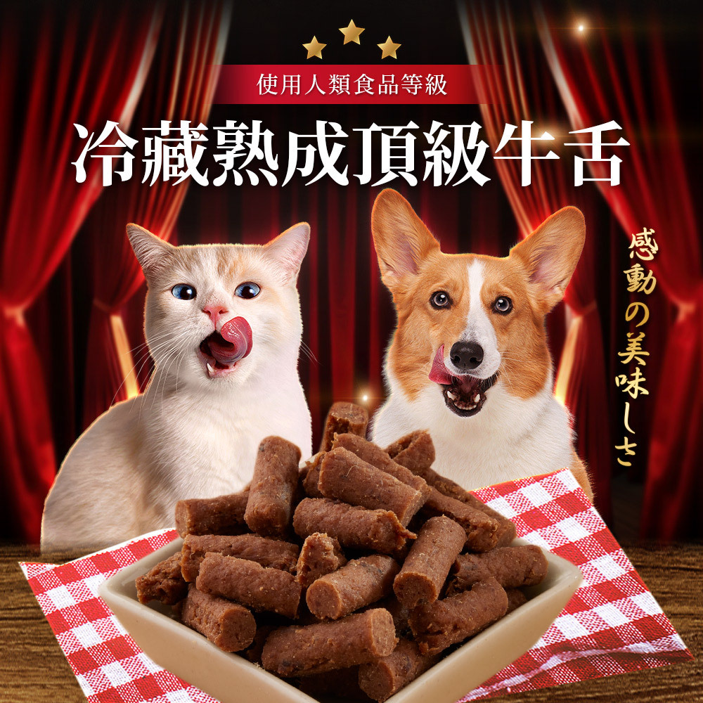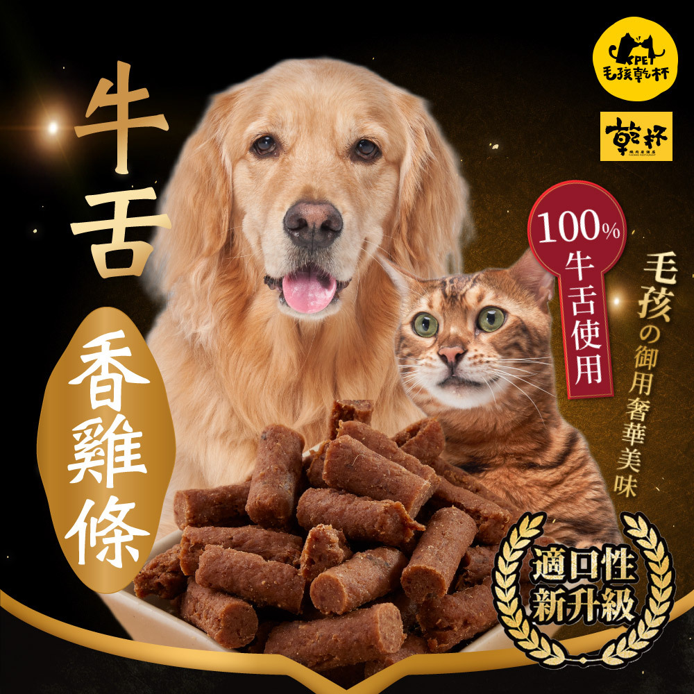 以雞肉、牛舌為原料,70度低溫烘培製成短棒狀。獨立小包裝充氮保鮮,食用與攜帶方便。添加雞肉適口性高。
